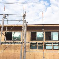2018年秋、悟りを開きかけてるゴッド今浦だ。先月、鮮烈なデビューを飾った真っ黒クロスケなあいつ。すすむすすむ工事は進む。サッシも黒で決める。木がむき出しの筋ばったボディに窓が装着された。サッシは通常シルバー系が多いが、ガルバリウムの黒い外壁を採用する家だけにやはりサッシも例外なく黒を採用。