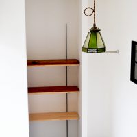 キッチン横の飾り窓。アンティークガラスをはめたオリジナルな一品。