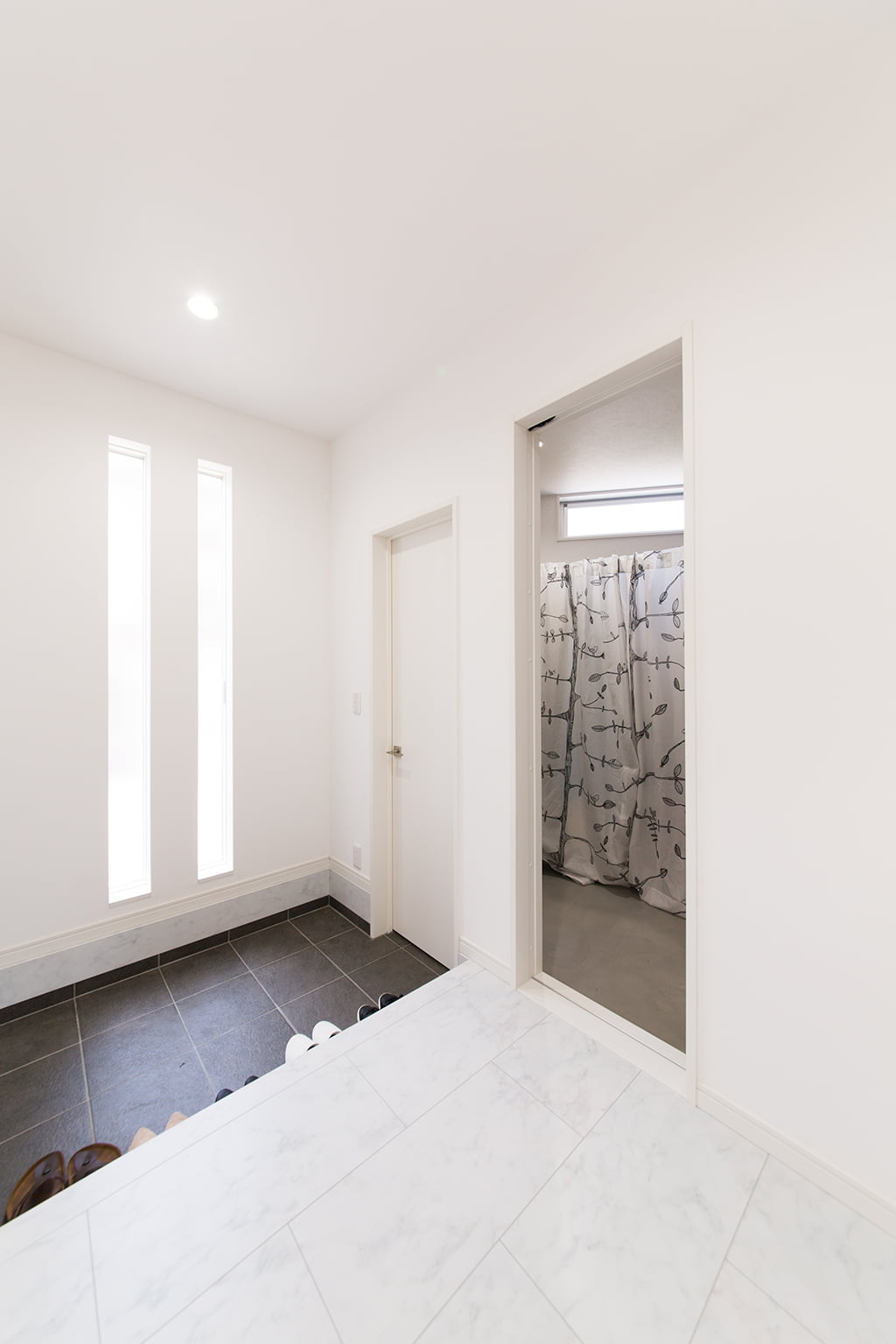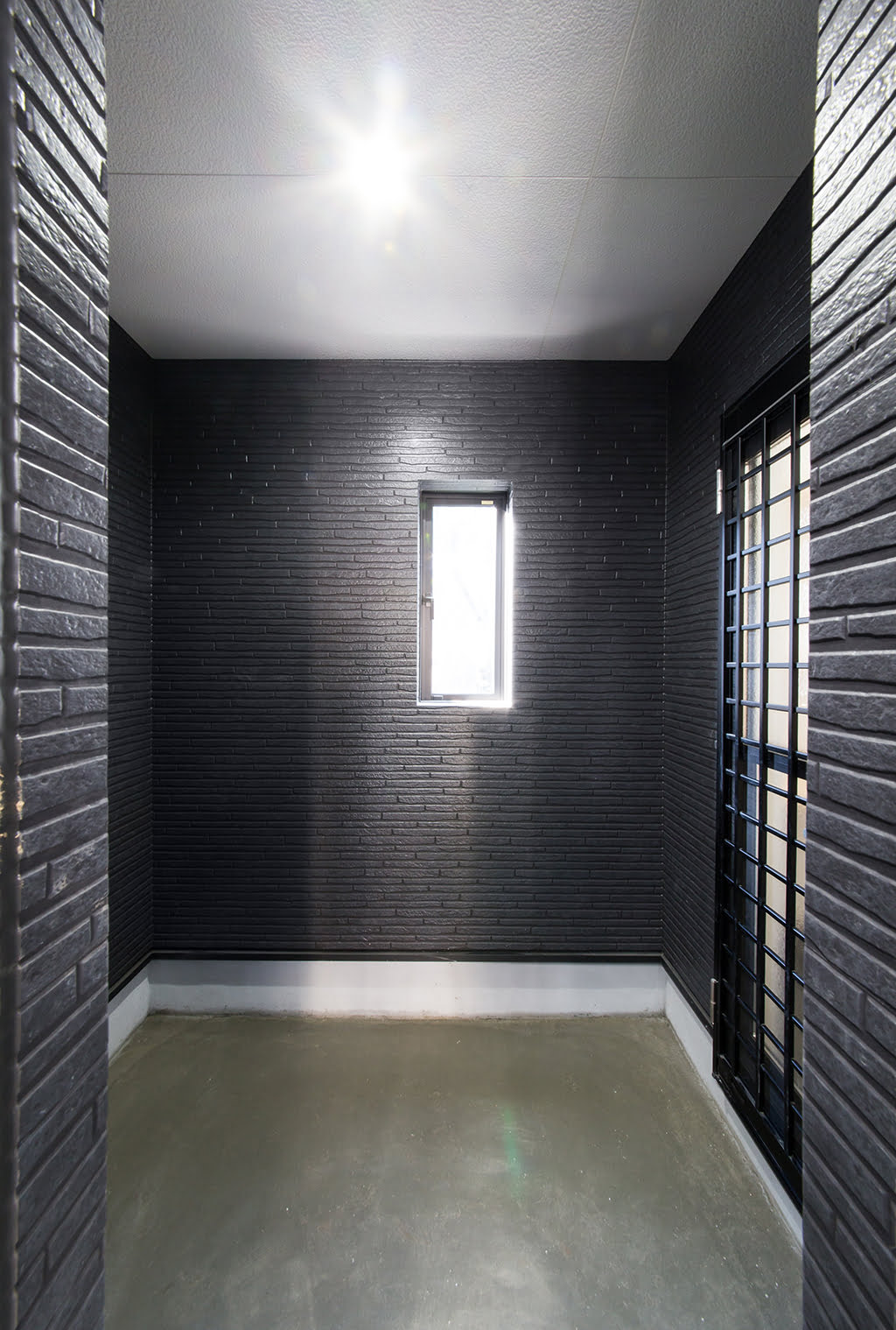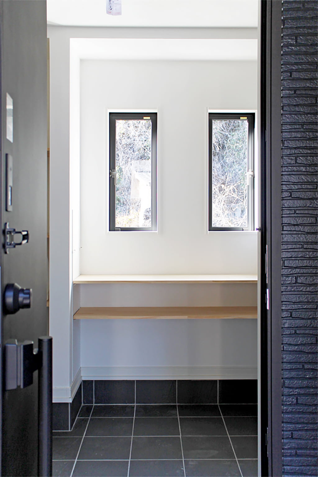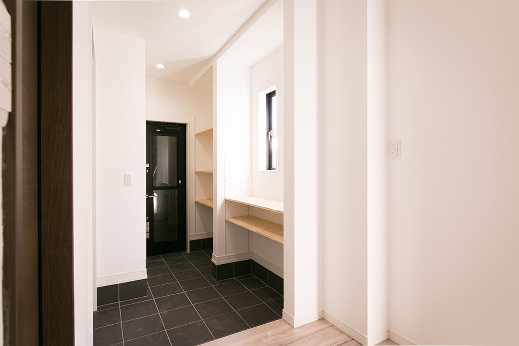 黒いタイルがシブい玄関ホールの登場だ。